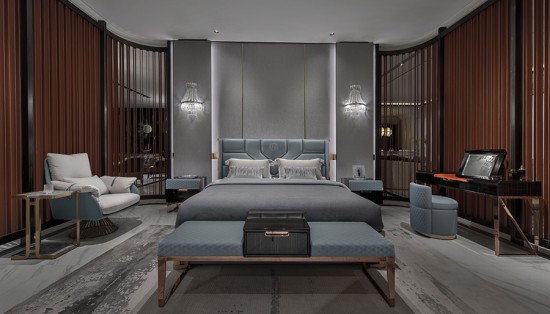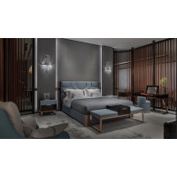 這款床是我們非常暢銷的產品,整體造型纖細精致、線條簡單。珊瑚藍色彩的運用令人放松,床頭的幾何造型軟包在提供了美觀的視覺體驗之余,更增添了舒適感,您可以感受一下,并且這款床配套的尾凳引用了時尚的菱形格設計,融入金屬等元素,打造了一個完美的臥室空間。
