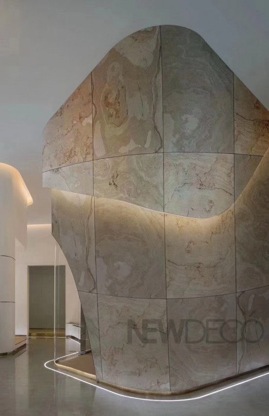 成品厚度1-3mm,每平米重量約1.5kg左右,其產品具有天然石材質感,超輕,超薄,強韌可彎曲,可透光等特點,最大限度提升石材利用率,為節省能源,降低運輸與安裝消耗做出巨大貢獻,不但改變了多年來使用粗石材的歷史,更因其獨特的自然紋理,超強的任性和可進行極限彎曲的特性,為石材裝飾創造了更多的可能性。
