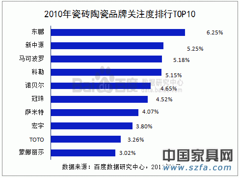 據第三方數據顯示,2010年,我國墻地磚產量達70億平方米,衛生陶瓷突破14000萬件。從品牌來看,東鵬、新中源、馬可波羅和科勒是網民關注度較高的瓷磚陶瓷品牌,關注度均在5%以上。諾貝爾、冠珠、薩米特、宏宇、TOTO和蒙娜麗莎分列第五到第十位。