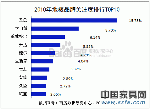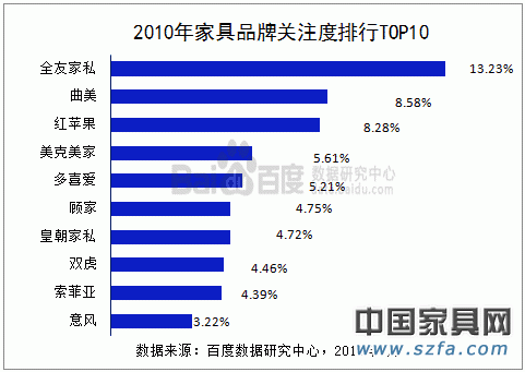 2010年家具品牌市場競爭較為激烈,關注占比不相上下。全友家私家具以關注占比13.23%,位居家居品牌關注榜榜首。