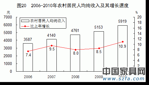 全年農村居民人均純收入5919元,剔除價格因素,比上年實際增長10.9%;城鎮居民人均可支配收入19109元,實際增長7.8%。農村居民家庭食品消費支出占消費總支出的比重為41.1%,城鎮為35.7%。按2010年農村貧困標準1274元測算,年末農村貧困人口為2688萬人,比上年末減少909萬人。
