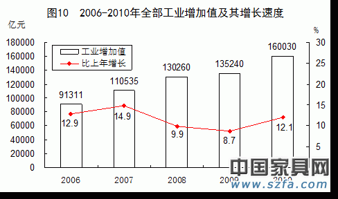 全年全部工業增加值160030億元,比上年增長12.1%。規模以上工業增加值增長15.7%。在規模以上工業中,國有及國有控股企業增長13.7%;集體企業增長9.4%,股份制企業增長16.8%,外商及港澳臺商投資企業增長14.5%;私營企業增長20.0%。輕工業增長13.6%,重工業增長16.5%。