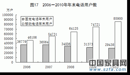全年完成郵電業務總量[9]32940億元,比上年增長20.6%。其中,郵政業務總量1985億元,增長21.6%;電信業務總量30955億元,增長20.5%。全年局用交換機容量減少2707萬門,總容量46559萬門;新增移動電話交換機容量[10]6433萬戶,達到150518萬戶。固定電話年末用戶29438萬戶。其中,城市電話用戶19662萬戶,農村電話用戶9776萬戶。新增移動電話用戶11179萬戶,年末達到85900萬戶。其中,3G移動電話用戶[11]4705萬戶。年末全國固定及移動電話用戶總數達到115339萬戶,比上年末增加9244萬戶。電話普及率達到86.5部/百人。互聯網上網人數4.57億人,其中寬帶上網人數4.50億人;互聯網普及率達到34.3%。