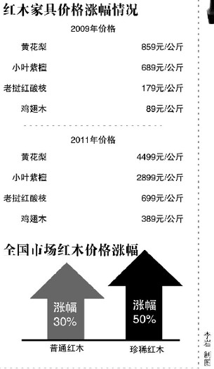 從按斤論價的某國內知名紅木家具的價格清單來看,從2009年9月至2011年9月,幾種主要紅木材質的家具產品售價上漲了3到5倍,呈現出新一輪價格飆升態勢。紅木家具價格漲幅遠高于同期黃金價格的漲幅。據了解,2005年到2009年之間,紅木的價格完成了從高山到谷底的大起大落。2009年9月以來,隨著國際金融危機影響的減弱,紅木市場的行情迅速熱了起來,一份紅木家具的價格清單顯示:越南黃花梨家具售價859元/公斤,小葉紫檀家具售價689元/公斤,老撾紅酸枝家具售價179元/公斤,非洲雞翅木家具售價89元/公斤。到2011年9月,黃花梨家具售價4499元/公斤,小葉紫檀家具售價2899元/公斤,老撾紅酸枝家具售價699元/公斤,雞翅木家具售價389元/公斤。價格漲幅從3到5倍不等。從該價目清單看,2010年以來,幾乎每月調整一次價格,并且都是提高。