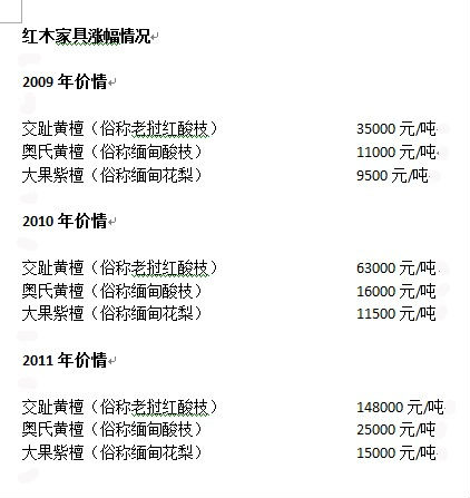從國內某知名紅木家具生廠商提供的原材料價格清單來看,從2009年至2011年,各類紅木家具的原材料成本較之過去呈現翻倍增長趨勢。根據清單顯示:老撾紅酸枝2009年價格僅為35000元/噸,2010年翻番價格上升為63000元/噸,2011年9月份又在2010年基礎上翻番,成交價為148000元/噸;緬甸酸枝則在2009年的11000元/噸,價格飛漲到如今的25000元/噸;就連紅木家具中較為便宜的緬甸花梨,價格也從2009年的9500/噸上漲到目前的15000元/噸。
