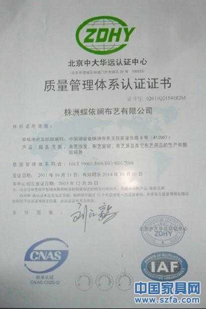 通過ISO9001質量管理體系認證是蝶依斕家居永恒的主題,質量是一個品牌發展壯大的關鍵,在逐步完善質量體系的進程中,經過長時間的準備,2000年伊始,蝶依斕家居就申請了——ISO9000國際質量體系認證,此次認證邀請的是國內最權威的北就中大華遠認證中心作為蝶依斕質量體系的審核單位,認證的范圍包括蝶依斕家居布藝沙發,布藝窗簾,布藝床及其它布藝有品的生產和售后服務。在本次考核過程中,認證中心專家對蝶依斕家居產品的研發、生產、檢驗等每個環節進行了認真、仔細的檢查,對產品標準、生產流程、工藝文件、原材物料管理制度等進行了嚴格的檢查考核,此外,專家們還對蝶依斕公司質量管理制度貫徹執行情況進行了檢查考核,所有檢驗、考核都順利通過。