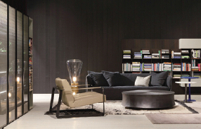 Poliform的新款茶幾均為金屬,使用了深色木紋色與客廳產(chǎn)品進行配套。圖中的這款圓形茶幾直接采用了木樁造型,面板上凹凸有致的仿木紋機理成為最大的亮點。這一做法超越了板式套房家具的一貫作風,儼然是雕塑藝術和師從自然思想在家具設計上的運用。