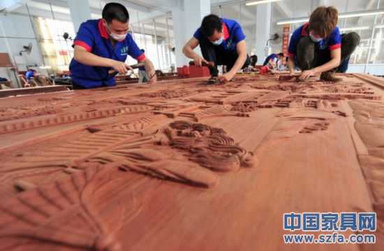 工人集體雕刻一件價值一百多萬元的紅檀掛屏
