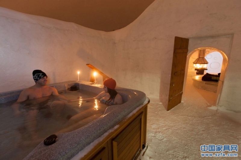 為了吸引更多游客,瑞典、挪威、加拿大等國紛紛推出了冰酒店。冰酒店并不是大號版圓頂冰屋那么簡單,而是建造者的精雕細琢之作,同時還為游客提供世界級的服務(wù),例如自助早餐、桑拿浴、觀賞北極光和體驗狗拉雪橇,讓他們度過一個難忘的假期。魁北克冰酒店的高端套房,備有桑拿浴和熱水浴缸。