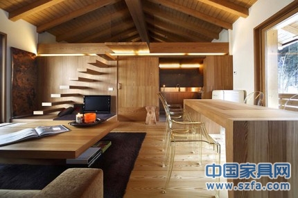 你即將進入一個全部由木材建造的地方,從地板、天花板甚至是家具,所有的一切都為木質,這種獨特的細節將這個公寓裝點得無比迷人、溫馨,讓人眼前一亮。這是一棟能讓你聯想到滑雪度假村的公寓。