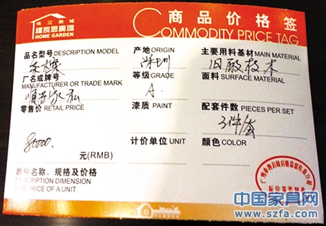 記者日前走訪了城中多個主流賣場,每個賣場少則有四五家紅木家具店,多則有八九家,但記者看到,只有少數(shù)商家為產(chǎn)品準(zhǔn)備了“一書一卡一證”,絕大多數(shù)商家仍然只有一張價格標(biāo)簽,只是標(biāo)簽上的內(nèi)容有了改進(jìn),如某大賣場的一家紅木家具店,在幾個月前的標(biāo)簽還是籠統(tǒng)標(biāo)注“紫檀”、“花梨”,現(xiàn)在則清晰地標(biāo)注“俗稱”、“中文學(xué)名”和“拉丁文名”。