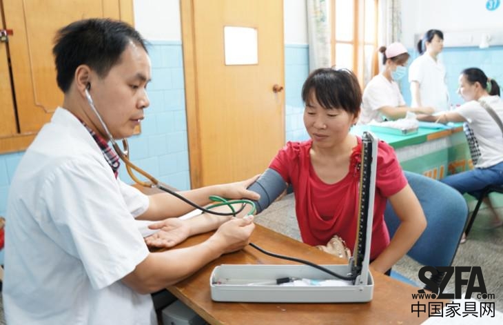 醫(yī)生在為蝶依斕員工作常規(guī)檢查(血壓測量 抽血化驗(yàn))