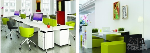 這款辦公家具的設計造型已經申請專利,桌沿以流水線條的形式引導使用者側身而坐,使并排而坐的工作者之間也能擁有相對私密性。沒有采用傳統的落地屏風作為間隔,只是在桌面上以輕快的果綠色亞克力材料或綠色植物稍作隔板,營造開放、活潑、高效溝通的辦公氛圍。同款樂樂休閑沙發套件由多個單件組合而成,可根據整體空間的尺寸、個人喜好、功能需求等對模塊進行移動組合,多變的造型能適應多種場合需求。