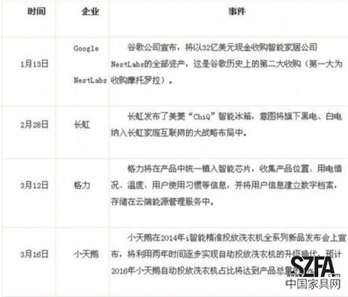 4月2日,三星在韓國(guó)、美國(guó)、英國(guó)、德國(guó)等11個(gè)國(guó)家推出“三星智能家居”系統(tǒng),初步實(shí)現(xiàn)了通過(guò)網(wǎng)絡(luò)連接所有電子家電的“物聯(lián)網(wǎng)時(shí)代”。三星智能家居使用戶通過(guò)一個(gè)綜合應(yīng)用軟件就可以隨時(shí)隨地控制管理冰箱、洗衣機(jī)、空調(diào)、電磁爐、機(jī)器人清掃機(jī)等大部分生活家電產(chǎn)品與家庭照明。