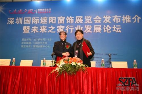 2014 年 3 月 8 日,由廣東省家用紡織品行業協會、全國遮陽窗飾產業聯盟主辦的深圳國際遮陽窗飾展覽會發布推介暨未來之家行業發展論壇在深圳會展中心隆重開幕。 全國工商聯紡織服裝業商會副會長、中國家用紡織品行業協會副會長、廣東省家用紡織品行業協會黃錦權會長,全國工商聯紡織服裝業商會布藝分會副會長、廣東省家用紡織品行業協會常務副會長蔡榮華、 黃小洪、 李植茂、梁洪輝、劉錦釗, 鄧源津、 陳溢銘、 黎建榮, 全國工商聯紡織服裝業商會副會長李巍,上海市裝飾裝修行業協會副會長、建筑遮陽專業委員會主任、 SORARA 晴天花園總經理黃永, 中國建筑節能協會常務理事、上海市裝飾裝修行業協會副會長、上海名成建筑遮陽節能技術股份有限公司殷文, 中國建筑節能協會常務委員、 英國朗絲集團總裁、浙江朗德實業有限公司總經理余建明, 寧波杜亞機電技術有限公司總經理鮑永林,法國尚飛中國市場總監劉繼武, 德錄峰(上海)節能設備有限公司總經理李希雷先生,路川金域電子(上海 )有限公司全國銷售經理胡斌,上海名成企業副總裁殷建生等全國遮陽窗飾產業聯盟領導、 企業代表, 全國軟裝布藝大型零售商代表, 深圳國際家紡展遮陽窗飾參展商,建筑、 酒店工程、 裝飾公司等相關行業嘉賓共同出席本次盛會, 相互交流、 探討節能遮陽與家居智能化行業的發展模式與未來前景。