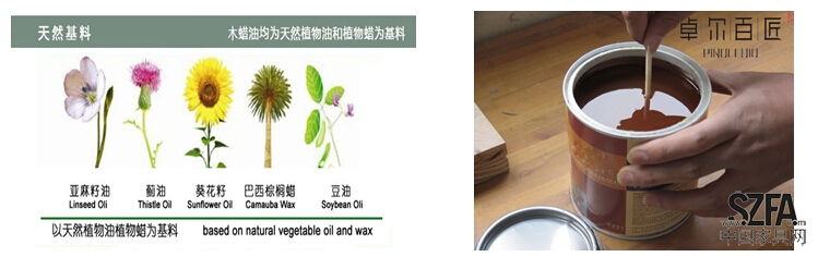 木蠟油是植物油蠟涂料國內的俗稱,是一種類似油漆而又區別于油漆的天然木器涂料,它和目前那種基于石化類合成樹脂所生產的油漆完全不同,原料主要以精練亞麻油、棕櫚蠟等天然植物油與植物蠟并配合其它一些天然成分融合而成,連調色所用的顏料也達到了食品級。因此它不含三苯、甲醛以及重金屬等有毒成分,沒有刺鼻的氣味,可滲透到木材內部,對木材起到深層滋潤保養的作用。蠟能與木材緊密結合,增強表面硬度,防水防污。
