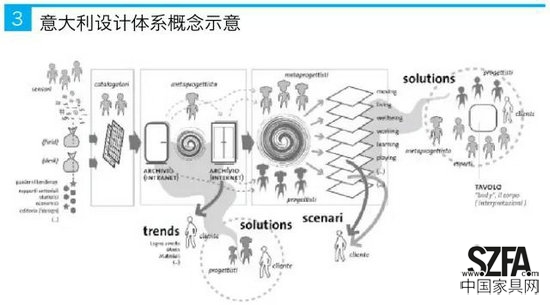 德國的短板恰恰是意大利家具產業體系的優勢所在,那就是整個產業生態都是按照設計驅動來建立的,依靠的是以中小型企業為主體的產業集群。意大利設計從潮流的研究、場景的構筑,到概念設計,以及最終的解決方案,能夠始終給消費者帶來不一樣的驚喜感覺,并引領著全球設計的走向,見圖3所示。