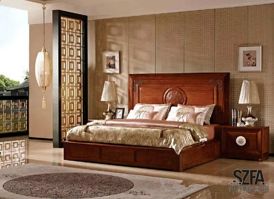俗話說家和萬事興,而夫妻和合乃家和之本。瀚晟堂的這套夫婦和合臥房組合包括床、床頭柜、梳妝臺,以夫妻和諧同心為設計理念,寬厚用料,取坤卦象征大地母性般的承載、包容,以聚氣的“金斗型”造型風格為主,以求藏風聚氣,和氣生財。床為臥房家具的主體,最能營造臥房的和諧美滿感。該床沉穩內斂,床屏為高背式,箱式床體與高靠背床屏的對比設計顯得高低錯落有致;搭配方正的床頭柜,精美圓融的金鑲玉點綴,華美大氣;首尾呼應床屏上的圓形“祥云如意”浮雕,寓示著家庭的如意美滿。床搭配同樣造型的床頭柜、梳妝臺,處處考慮方圓結合,和諧統一。
