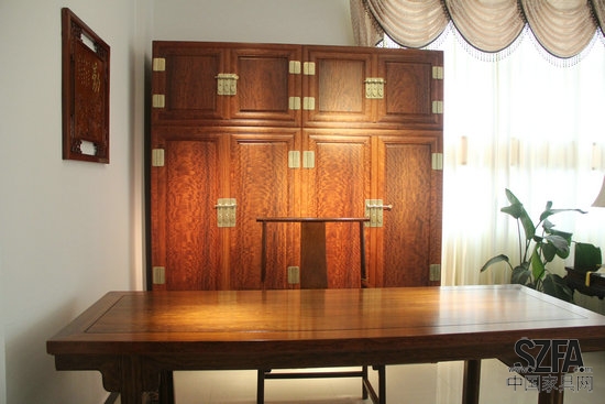 還如一木三開的花酸枝明式光身書案、大紅酸枝合家歡十一件套等等,都是當代家具界難得一見的珍品,是最有收藏價值的紅木家具新星。