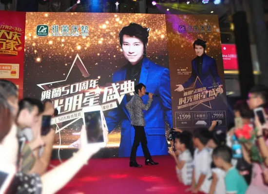 為了回饋忠實用戶,雅蘭推出50年榮耀款「卡麗蘭」床墊,由邰正宵現場簽售。邰正宵心系粉絲,幽默地向經銷商喊話,幫粉絲申請更多優惠。經銷商爽快答應,凡是現場購買「卡麗蘭」床墊的客戶均可獲贈豪華配套床架。贏得現場歌迷一片歡呼!