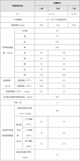 新標準增加了對皮革和人造革的要求,具體限量要求如下: