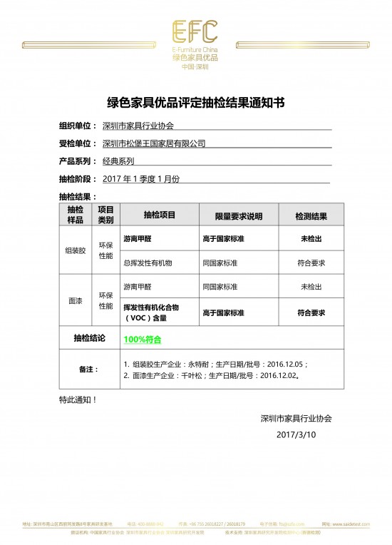 3月10日,深圳市家具行業(yè)協(xié)會檢測中心(賽德檢測)針對松堡王國一季度1月份的抽檢工作圓滿結(jié)束,松堡王國再次以兩項“未檢出”、兩項“符合要求”的100%合格率完美通關(guān)。