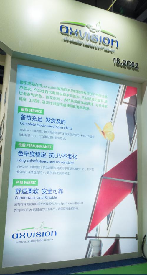 晴晴旗下的axvision(愛尚庭)室外多功能布搭配穩定可靠的著色工藝以及細膩短長纖混織, 使得材質軟硬適中且高強度拉力。愛尚庭多功能布料在使用中,不僅壽命長、色牢度穩定、抗曬等級達到ISO105B02/B04標準的7-8級(最高為8級),而且布料全面經抗紫外線處理, 日光保護指數可達UPF 50+,深受消費者喜愛,整個生產過程安全環保,很快在戶外布料行業中脫穎而出。(如圖是2017CIFF 18.2C02展位展品圖)