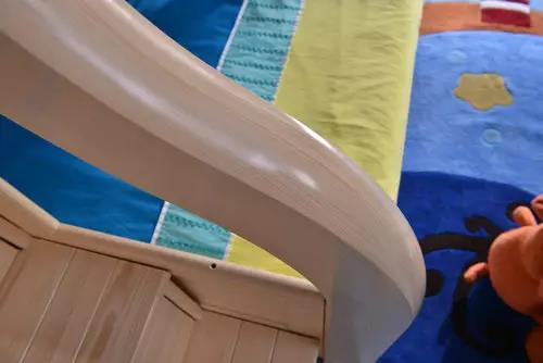 雙層床的樓梯從安全角度出發(fā),也設(shè)計(jì)為弧形狀,有效將力垂直向下分解,減輕梯子的受力。“樓道”彎曲的木材采用獲得專利的彎曲拼板工藝設(shè)計(jì),是從整根原木中直接取出來的,非常牢固、安全,而且彎曲弧線制作成大象鼻子的造型,增添童趣。階梯上的抽面板運(yùn)用了隱形拉手,踏步板上附有防滑墊,有效避免孩子們摔倒或磕傷。