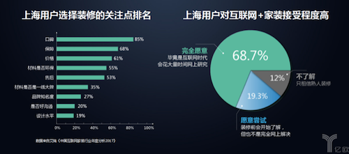 據易觀發布的《2017中國互聯網家裝行業年度分析》顯示,借助政策紅利,傳統產業迎來機會,線上流量將反哺線下產業,傳統線下產業將逐步互聯網化。另一方面,產業環境升級,家裝行業醞釀爆發態勢,純線下經營模式將趨勢漸弱,傳統營銷手段如電銷、樓盤蹲點失去效果,產業信息透明化提升,口碑差異顯現,互聯網家裝滲透率將快速提高。