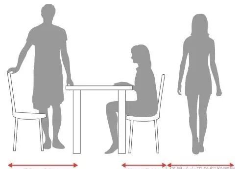 人坐在椅子上的的寬度約為50cm,將椅子拉開坐下時所需的寬度約為80cm,椅子后面還需要留出至少60cm的通道才能滿足餐廳的使用空間。