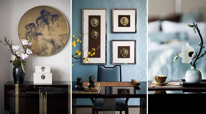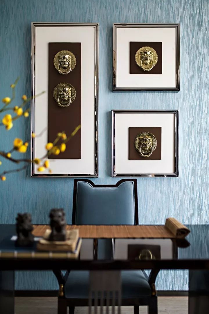 簡化改良版的中式書桌椅,散發(fā)著清雅氣質之美,背后的組合裝飾畫更是別出心裁,畫中的獸首門環(huán),商周銅飾中早已有之。