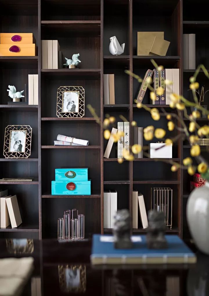 滿腹經綸、一紙書香,提到文人我們總會有這樣的印象,書房設計最能體現(xiàn)人的精神世界。一個簡約大氣、古色古香的書架占據了書房入口右側的整面墻壁,沉穩(wěn)的深木色,沉淀的優(yōu)雅。