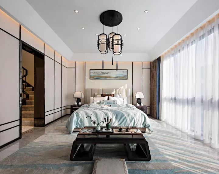 次臥設計以清淺的水藍色為主調,同色系的水流紋地毯、山水掛畫,于虛靜中賦予空間靈動氣韻。古雅的流蘇吊燈與壁柜的黑色線條呼應,委婉清秀。黑色的傳統(tǒng)案幾,將謙和與寧謐的心境定格。