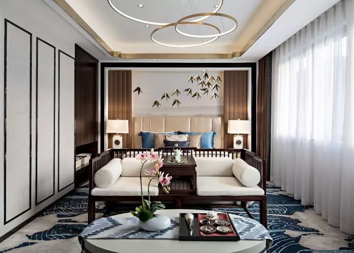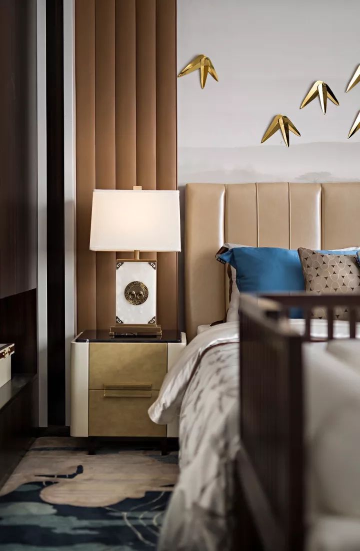 主臥套房位于安靜的五樓,散發(fā)著傳統(tǒng)意味的花紋地毯鋪陳于整個空間。床位的背景墻像一幅向兩側緩緩展開的山水畫卷,清淺、氤氳,韻味悠長,金色的竹葉裝點其間,將文人的“如竹之虛,如斯之雅”的君子風度淡然書寫。