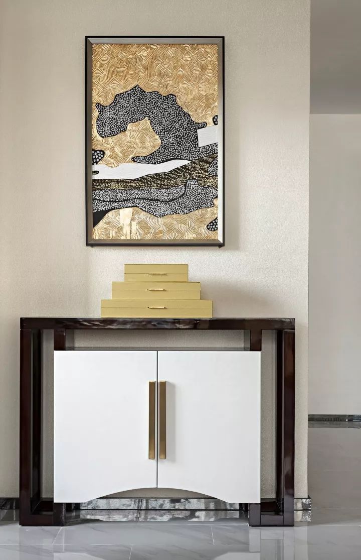 清雅的軟裝配色、木制長幾及流蘇吊燈,盡是古意。空間入口兩側以金色的傳統(tǒng)格紋裝飾鑲裹,與二樓的黑色扶欄呼應,大氣雅致,獨具傳統(tǒng)情調。客廳另一側是高至天花的大型書架,山水墨色藏于其間,營造出懷抱清曠,幽深雅致的空間氛圍。