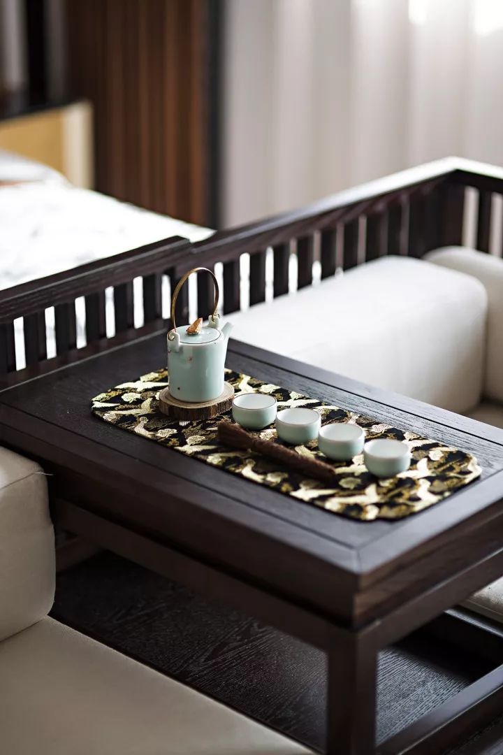 主臥空間還該特設一隅以作品茗區(qū),傳統(tǒng)的家具制式,結合現(xiàn)代的純白色軟包和中西合璧的圓桌,盡顯新中式設計的魅力。時有寒暑,月有晦明,而心靈張弛有度,可于此安放。