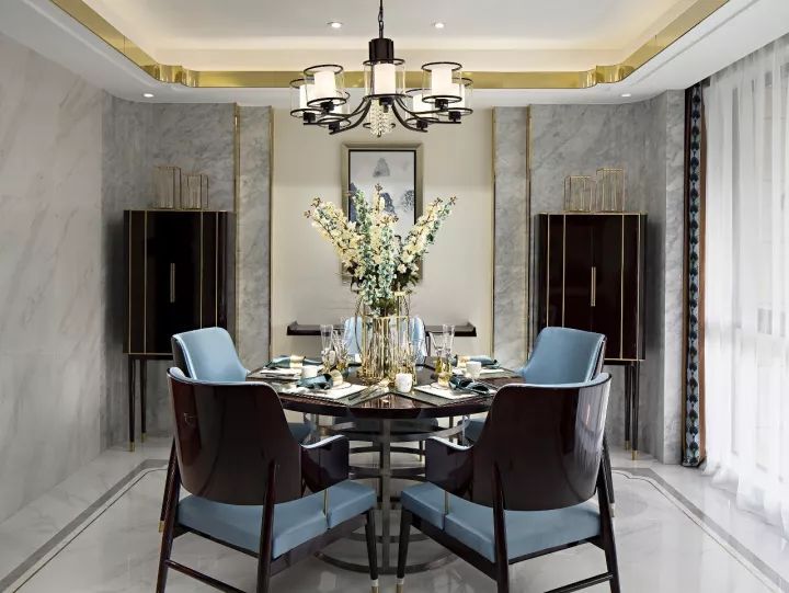 餐廳設計現(xiàn)代而不失整體的中式韻味,傳統(tǒng)的對稱布局嚴謹合度。在材質的選擇上適當加入玻璃和金屬等現(xiàn)代的裝飾材料,樣式新穎的餐椅和酒柜在細節(jié)處糅合了宋代家具設計美學。西式餐具于優(yōu)雅里凸顯莊重自得的心態(tài),清新花藝營造出馨香深遠沁人心脾的就餐氛圍。