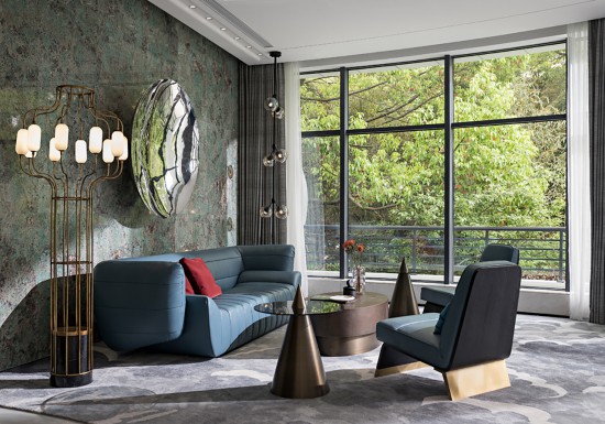 杭州景瑞陽明谷會所設計納入山湖自然清秀流雅的風貌,以現代藝術會所為主題,將大量前衛流麗的裝置藝術作品,以時尚的手筆融入空間,呈現一派靜謐深遠的當代意境。整體空間將優雅與現代人的審美相結合,浮華中有超脫,自然輕逸中容納著規則美。