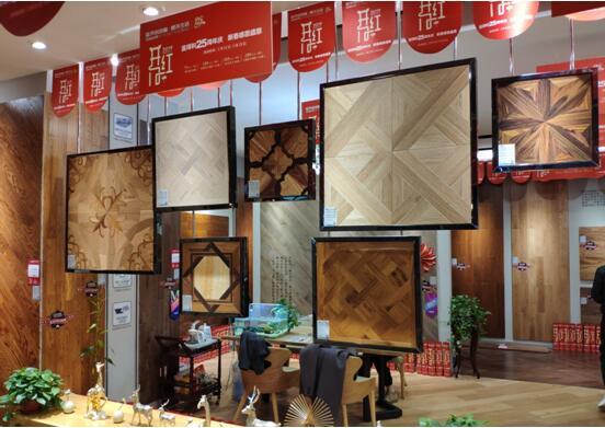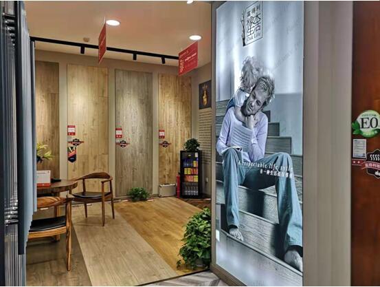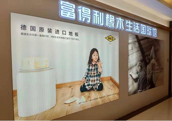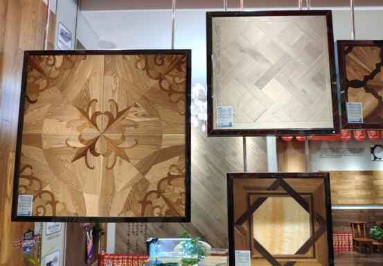富得利橡木生活館門口展示著HKS藝術拼花系列定制地板,裝裱外框后的拼花地板就像復古典雅的繪畫作品一樣,會吸引人駐足欣賞,如果從體驗角度來說,視覺感受還沒進館內就已經被營造起來了。不知道大家平時逛家居賣場是什么感受,落地的展示櫥窗,張貼的促銷海報,或者直接放一整套家居產品在店門口擁堵,小編想說這種展示方式所體現的審美已出露疲態了。
