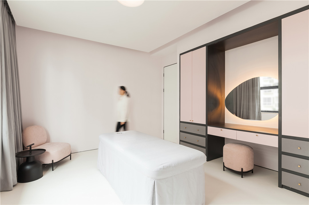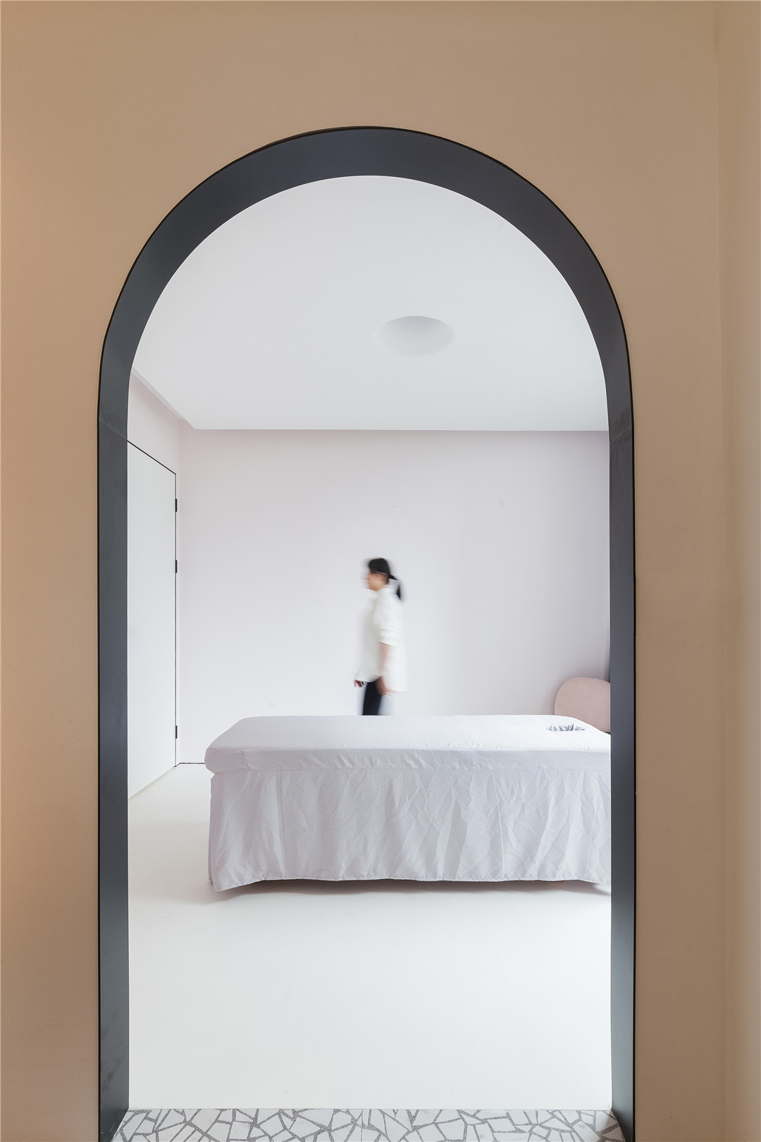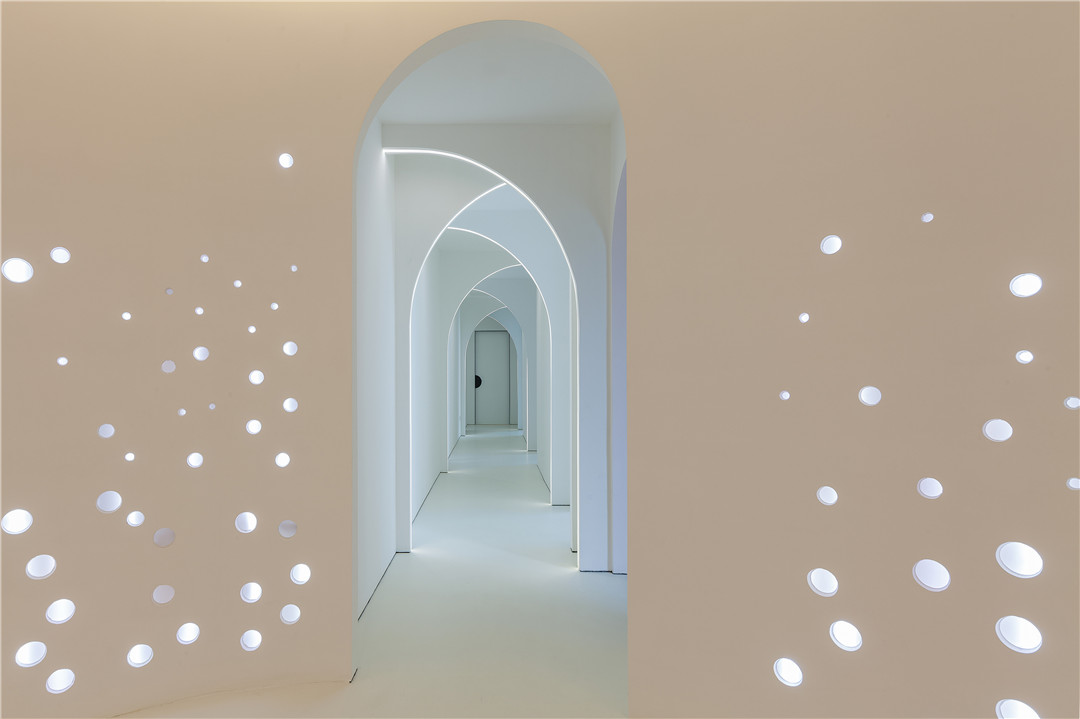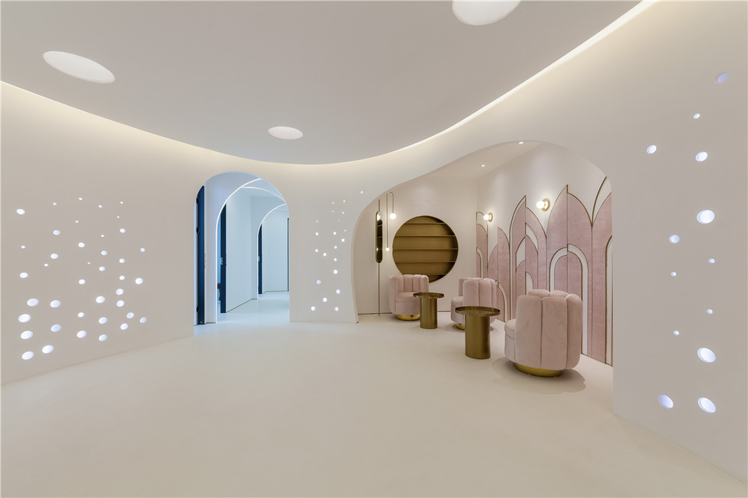 本次獲獎作品《lady mooi 女子醫(yī)療美容機構(gòu)》其靈感源自兩歲女兒的睡前故事,設(shè)計摒棄了以往該類型空間所采用的慣常的符號化做法,以“人魚公主”的故事為設(shè)計靈感,提取氣泡、水等夢幻元素,營造輕松、舒適、浪漫的環(huán)境,讓愛美的顧客們在這里有仿佛置身夢幻水世界的感受。一圈沖孔板從下往上、由大到小不規(guī)則排列,仿佛海底世界的氣泡,簇擁成柔軟、純凈的橢圓形空間。過道用燈帶鑲嵌半弧形攻門,錯落之間,一步一世界,那份變身的莊重在魔法的推演中漸漸實現(xiàn)。