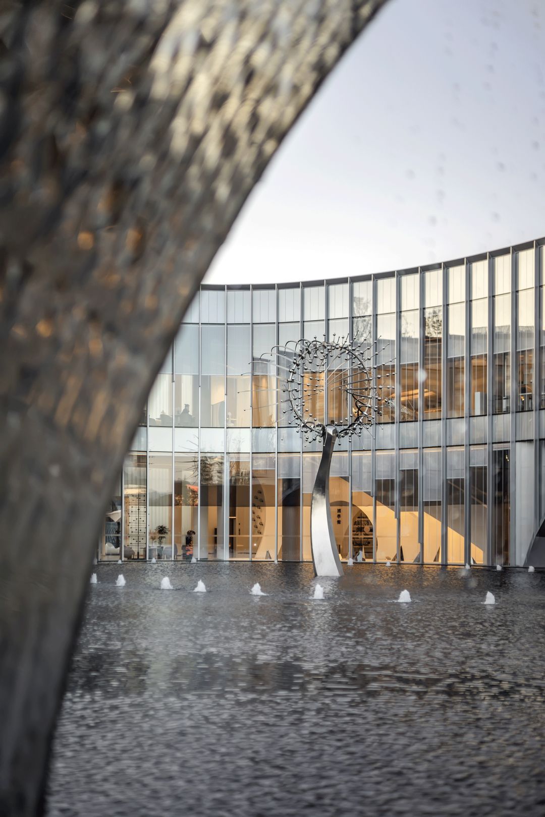 接待區就在這一理念之下,景觀以水之形態為伊始展開,而后又融入了似水也像風的流動意象,互相依融互不侵犯,這種結合東方元素的處理,又與建筑外觀的極盡現代形成對比。