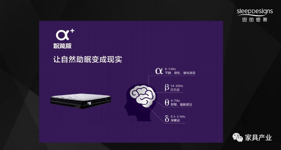此外思麗德賽還全新推出了“黑科技”α智能版床墊,它能夠記錄助眠波段和睡眠情況,進行智能分析學習,釋放α腦電波,實現(xiàn)個性化助眠,引人進入深睡眠。還能搭配手機APP感知人體睡眠情況,反饋每次睡眠數(shù)據(jù)。