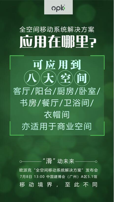 2019廣州建博會(huì)上,歐派克將首度發(fā)布“全空間移動(dòng)系統(tǒng)解決方案”,將產(chǎn)品從滑輪單品轉(zhuǎn)向以滑輪為主導(dǎo)的,涵蓋客廳空間、陽(yáng)臺(tái)空間、餐廳空間、廚房空間、衛(wèi)浴空間、臥室空間、衣帽間空間、書房空間的全空間定制解決方案,這不僅是歐派克品牌自身的重大突破,也將為定制行業(yè)揭開(kāi)未來(lái)新篇章。