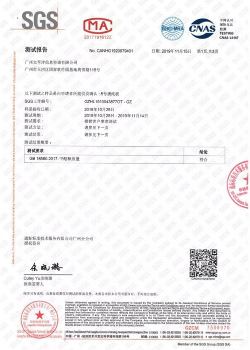 索菲亞綠色環保板材康純板自2016年推出以來,滿足了客戶居家健康需求,深受青睞。近日,康純板受邀參與測評,通過了全球領先的檢驗、鑒定、測試和認證機構SGS多項測定,這是繼去年獲得美國EPA(NAF)無醛豁免認可后,又一項國際認可。