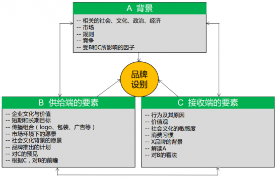 高端品牌的打造要先有精神后有物質,也就是說,需要首先從意識形態(tài)領域開始,而不是先有一手所謂的“高端產品”就能高端得了的。否則就是本末倒置,因為它沒有指導方針,所以就沒有根、立不正、長不高、壯不大、不可持續(xù)。高品質、高顏值固然重要,但不充分,他們還需要有靈魂,沒有靈魂就沒有品牌的生命。從語義學角度看,品牌是用一種隱喻的方式來講述一個“可能的世界”的故事,它必須被受眾感知到和其他的世界是不一樣的。建立這樣一個相關聯的品牌世界使得企業(yè)能夠獲得一個高價值的市場,而不僅僅是產品質量好一點、設計得漂亮一點那么簡單。品牌內涵與識別不是單向思維,而是A(背景)、B(品牌自身)、與C(消費端)共同作用所形成的。盡管在品牌創(chuàng)立的初始階段不排除企業(yè)和企業(yè)主可能會有自己獨到的見解和想法,但其是否能被目標市場所接受所喜愛還得需要在品牌與受眾及其他各利益相關者互動的過程中來檢驗、來修正、來優(yōu)化、來生根、來成熟、來壯大。其關聯要素詳見下圖1所示。