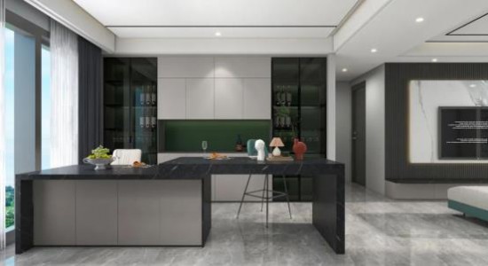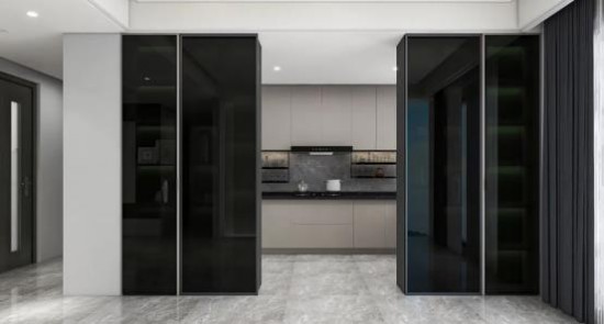 極致收納,于廚房可見。廚房門采用深色玻璃推拉設計,彰顯空間格調,更妙儲物收納功能的處理,化墻面為置物架,書籍、飾品擺放,擁有裝飾效果也提高空間實用性。