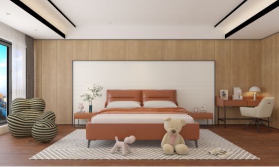 CBD家居·金豹 | J007軟床,暖橙色提亮空間,靠包輔以線條內嵌設計,體塊感更顯飽滿,自然倚靠,達到舒適與美感的平衡。創意單椅、簡易書桌各立于一角,打造出多元化場景,治愈溫馨。