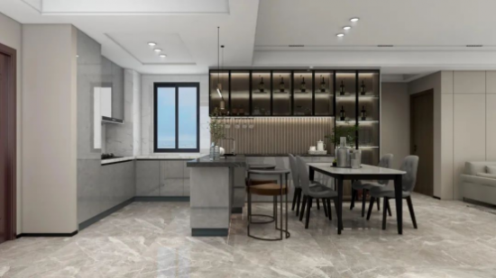 餐廚一體式設(shè)計(jì),加強(qiáng)了空間的交互性與通透感。增設(shè)中島吧臺(tái)作為隔斷,一側(cè)與入墻餐柜相連,柜內(nèi)裝飾線燈,兼具美觀度與實(shí)用性,是生活美學(xué)的彰顯。