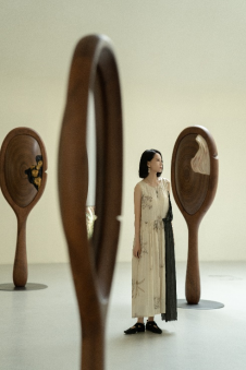 她設(shè)計了十二枚鏡面,構(gòu)成一個橢圓形裝置,象征生命的循環(huán)往復(fù)與時間的永恒流動。每一枚鏡子背后展示了對應(yīng)月份的花卉,象征自然界的變化與生命的節(jié)奏。鏡面采用了特別定制的幽靈鏡效果,具有漸變的反射能力;使觀眾在鏡前不僅能看到自己的倒影,還能模糊地感知到背景中的年輪圖案。這種交互效果使得觀眾的身影與自然的紋理相融合,增強(qiáng)了人與自然的連接感。觀眾可以在鏡面之間隨意走動,觀察不同鏡面的花卉與自己的倒影,與時間對話,回顧過去、審視現(xiàn)在并展望未來。