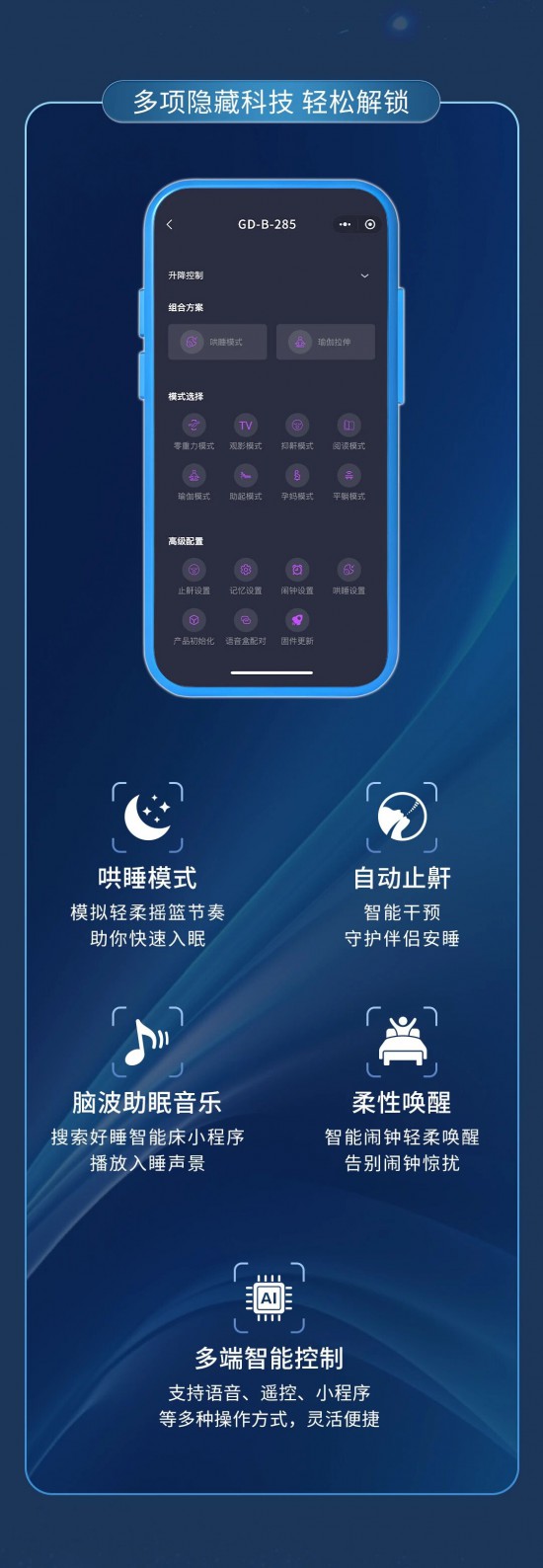 核心提示:智能聲控多維場景,優雅啟航,搭配電動智能床架一語智控,優雅變奏無需手動,無需起身。